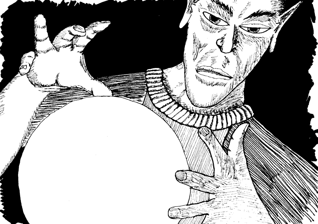 The next day (10/1), he brought out his crystal ball and concentrated on Lah’s Retreat. He didn’t dare spy on Lah himself or the inner chambers but rather the entrance to the estate itself. He saw the familiar scene where a two monks stood guard. This gave him confidence in his chances to teleport there accurately. He left Hocuspo with instructions to guard his hoard of gold and to keep the tower otherwise safe. And then he began the teleportation spell.