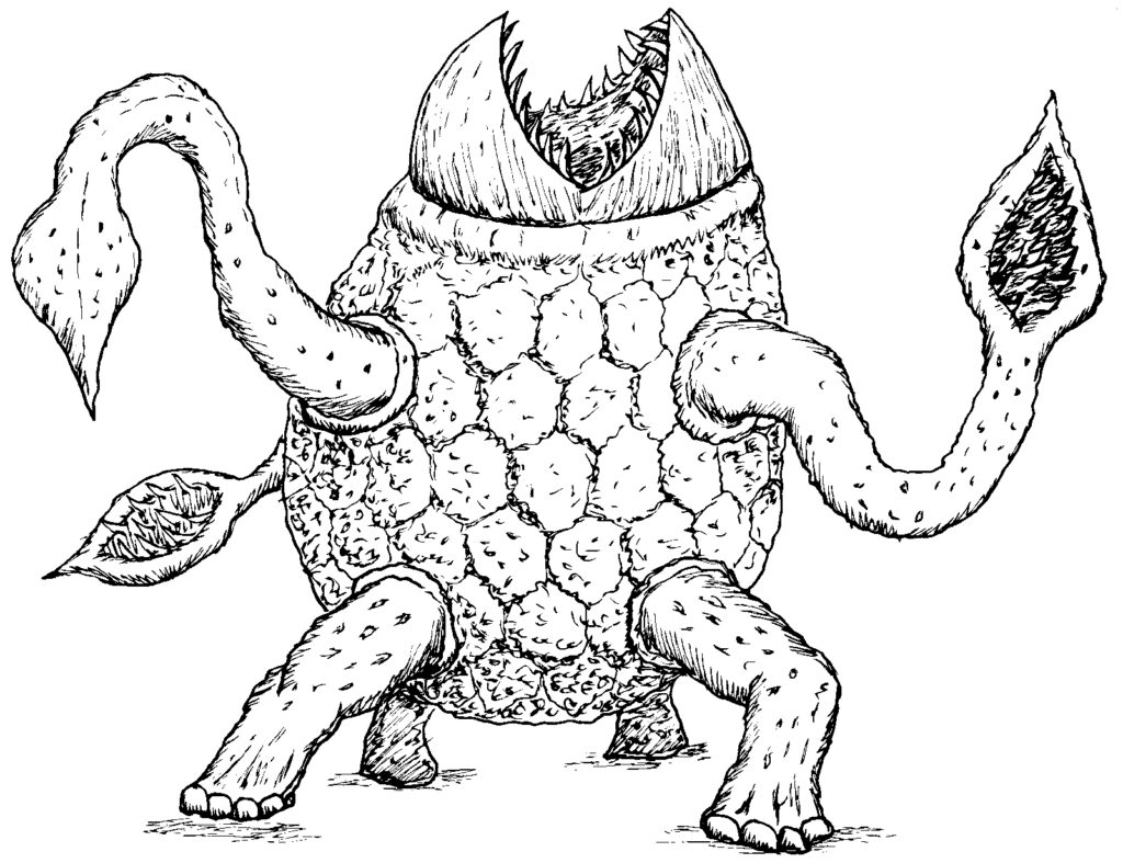 The stair ended in a large chamber where nine conical shapes stood silently. As Aderian approached, he saw they were perhaps 8 feet in diameter and stood on four squat legs. They were foul otyughs, and they advanced into battle. Three savage tentacles ending in pads filled with razor edges whipped through the air. The top of the conical body opened into a beak-like mouth will with more razor teeth. When the tentacles found purchase, they stuck and continued to dig in.