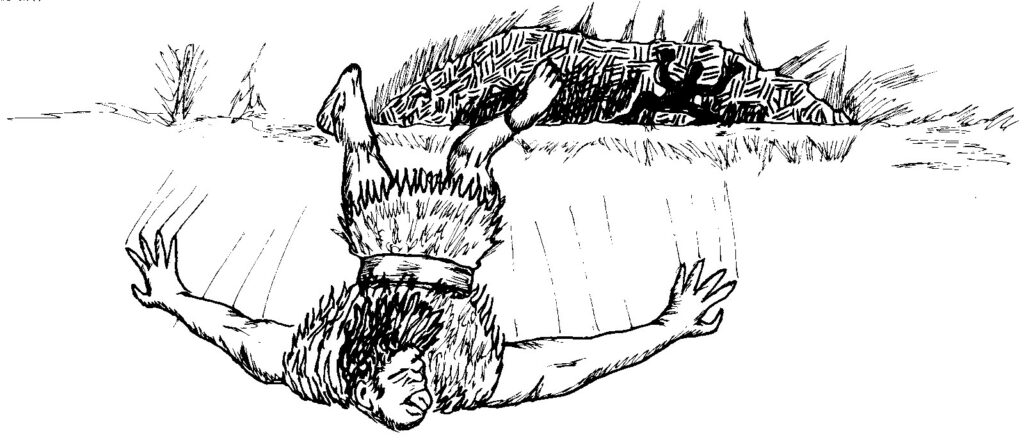 During this first part of the battle, Jerker had been looking for sticks, then handed two sticks to add to Ghevont’s bundle of twenty. The two of them raced out into the clearing in order to get close enough for Jerker to throw the bundle into the cave mouth. His aim was good, and Ghevont transformed the sticks just as they entered the cave. Presently, 21 rattlesnakes were spread out in the cave, striking at the giants.