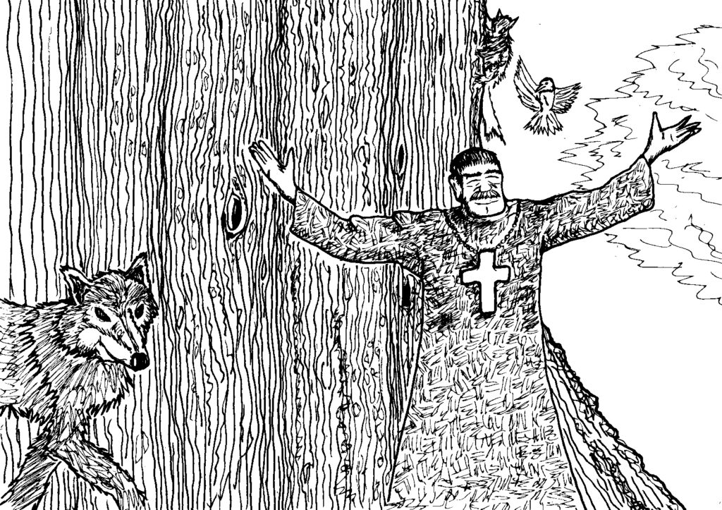 Meanwhile, Ghevont wandered back to the glade. He called forth all animals. Along with many birds and squirrels, seven dire wolves emerged. Two of the wolves were receptive to his sermon. The others presented a stance of clear and present danger. Gheveont attempted to speak with them in a soothing manner, but their aggressive nature got the best of them, and they moved forward to attack. Ollie and Nate were nearby, and they rushed up to defend Ghevont. The cleric used a spell to charm one of the wolves and then another spell to double its size.