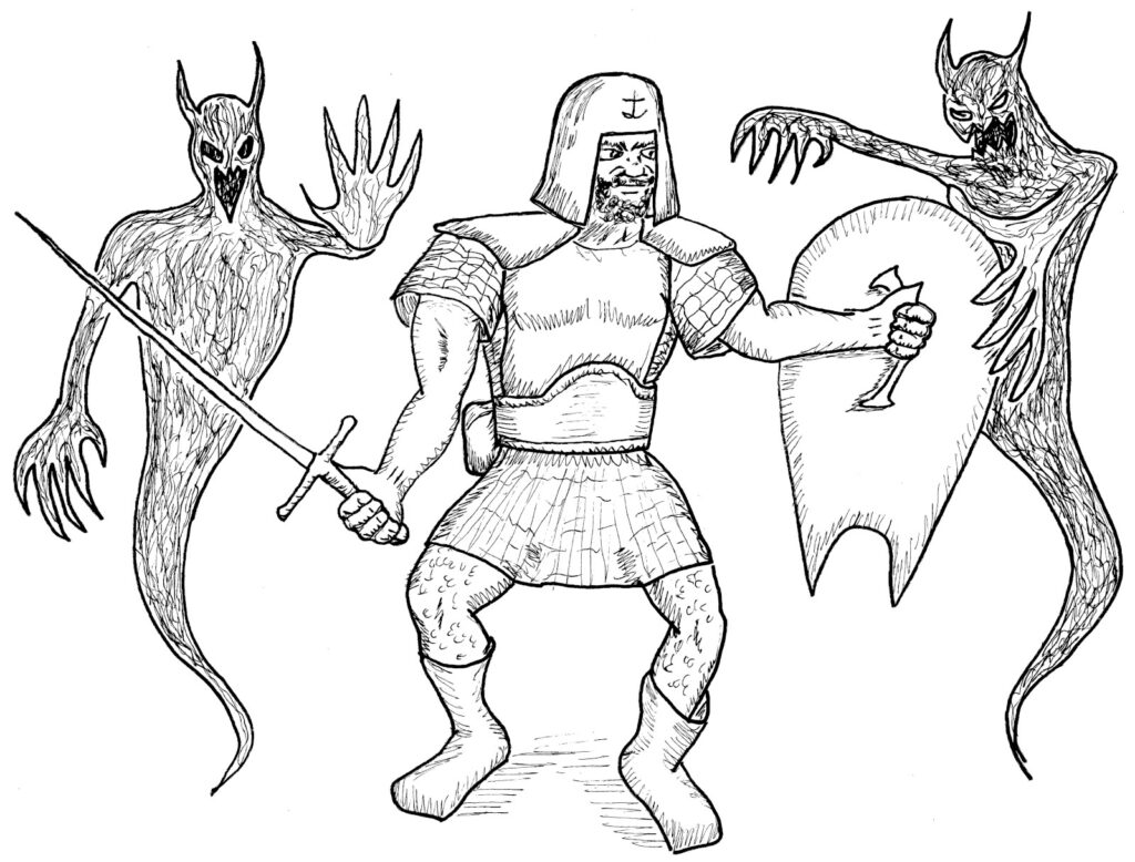 They had no appetite to explore further and agreed to head to New St. Kortus. Peter asked for the balance of his payment and intended to return to the river to catch the barge back to St. Orlan. They walked north to find a fortified holt designed to prevent a repeat of the fire that destroyed the old town twenty years before. It consisted of stone dwellings with sod roofs (fireproof) and 6 communal outbuildings, including a smokehouse and a stone-walled well. A 6-foot-high dry-stone wall surrounded the perimeter, topped with iron braziers that burned all night to keep werewolves at bay.