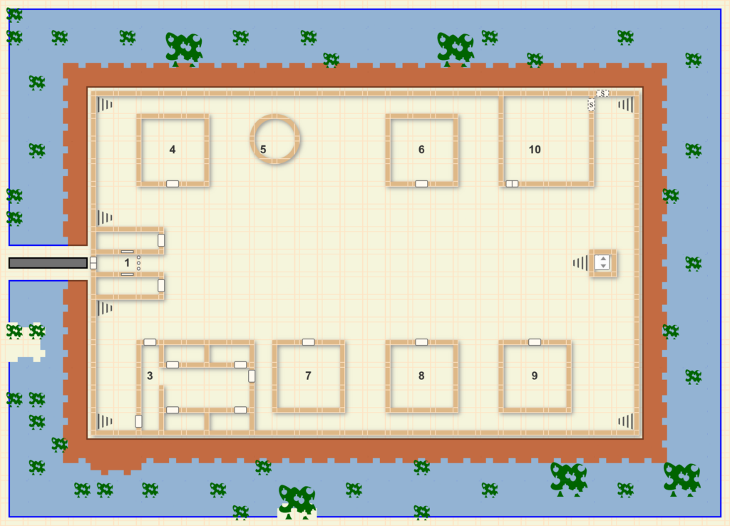 | Subterranean Chamber | 40 x 40 x 10 feet underground prison chamber with steep stair and heavy gate | 600 |